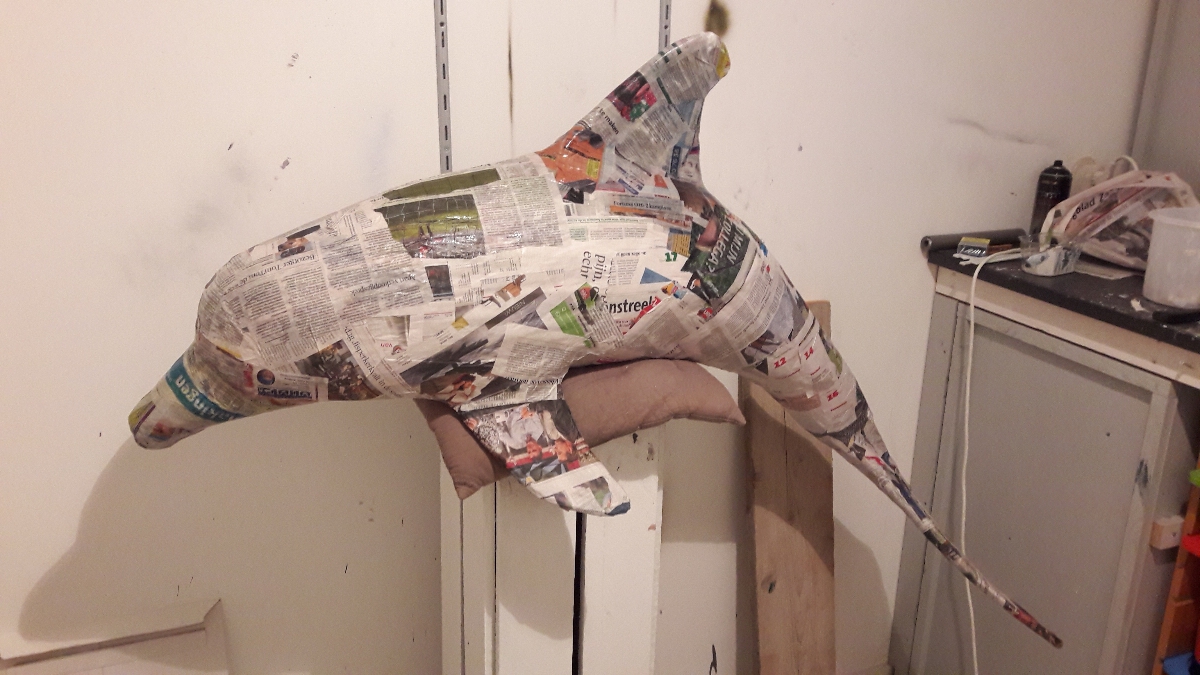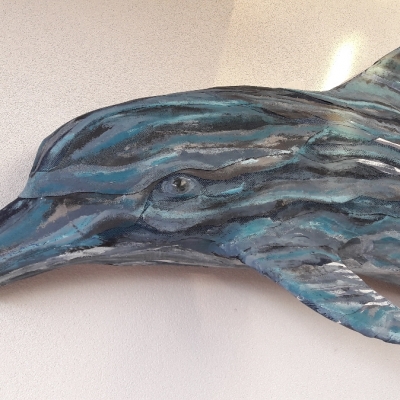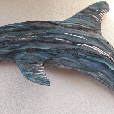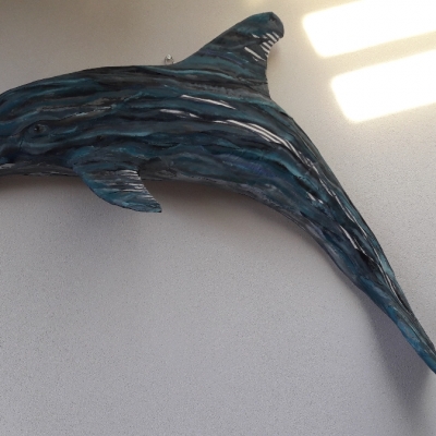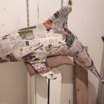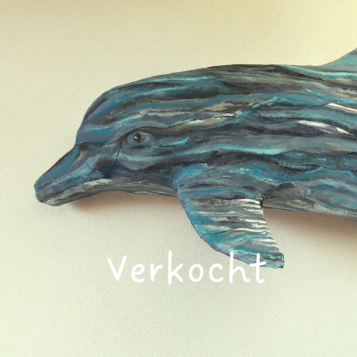 Formaat: rond 150 cm lang Materiaal:Bijzondere opdracht. Dolfijn gemaakt ivm overlijden echtgenoot opdrachtgever stof spijkerbroek en overhemd van haar echtgenoot verwerkt in het patroon van de dolfijn. Een prachtige manier een een iets van hem terug te laten komen in een dolfijn die een bijzondere plek in hun leven had en heeft.