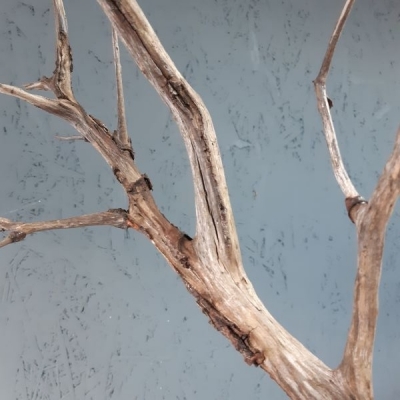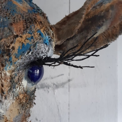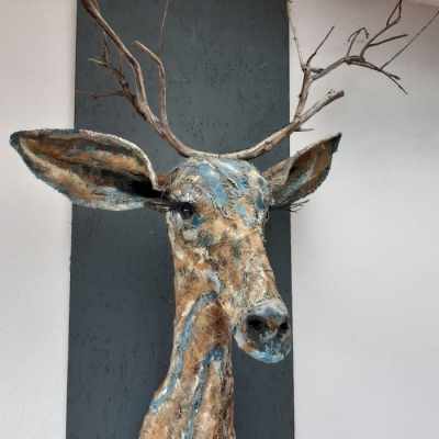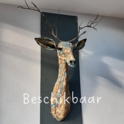 Hert met bruin- en blauwtinten. Gewei van echte takken. Deze lieve ranke rustige sfeermaker is nog beschikbaar.