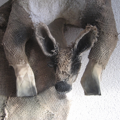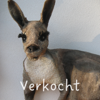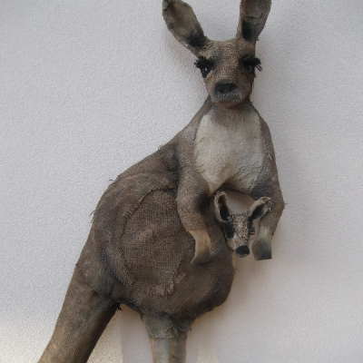 jute, kaasdoek, katoenen handdoek en diverse verfsoorten. Deze kangoeroe-familie is in opdracht gemaakt voor een jong gezin, vandaar het kleintje in de buidel van de moeder.
