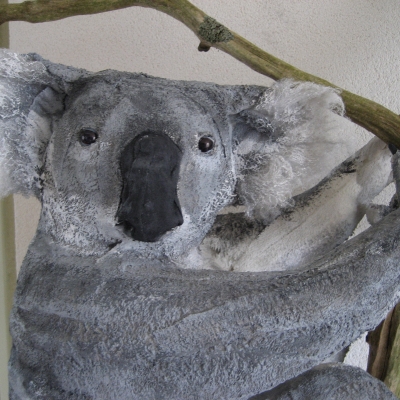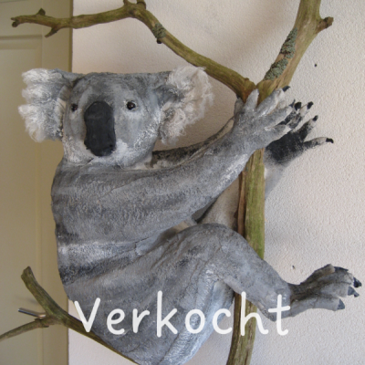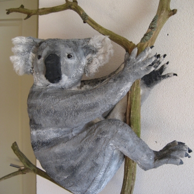 katoenen handdoek en kussenvulling (pluizige oren) en diverse verfsoorten. Deze koala is in opdracht gemaakt. Hij zit op een mooie tak, gevonden in het Noord-Hollandse duingebied.