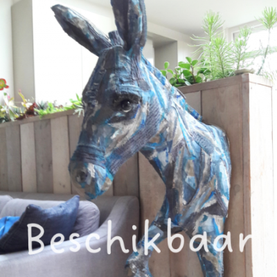 Formaat: H: 140 cm D: 50 cm B: 35 cm Materiaal:Dit aandoenlijke ezeltje is gemaakt van een verschillende spijkerbroeken en andere soorten stof. De verschillende lagen geven het ezeltje een lekker ruig uiterlijk. Een heerlijk vriendelijk dier dat de sfeer in uw huis zeker positief zal beinvloeden!! Mocht u geinteresseerd zijn neem dan even contact met mij op. Een mailtje via deze website kan uiteraard ook. Op dit moment is het ezeltje nog beschikbaar....